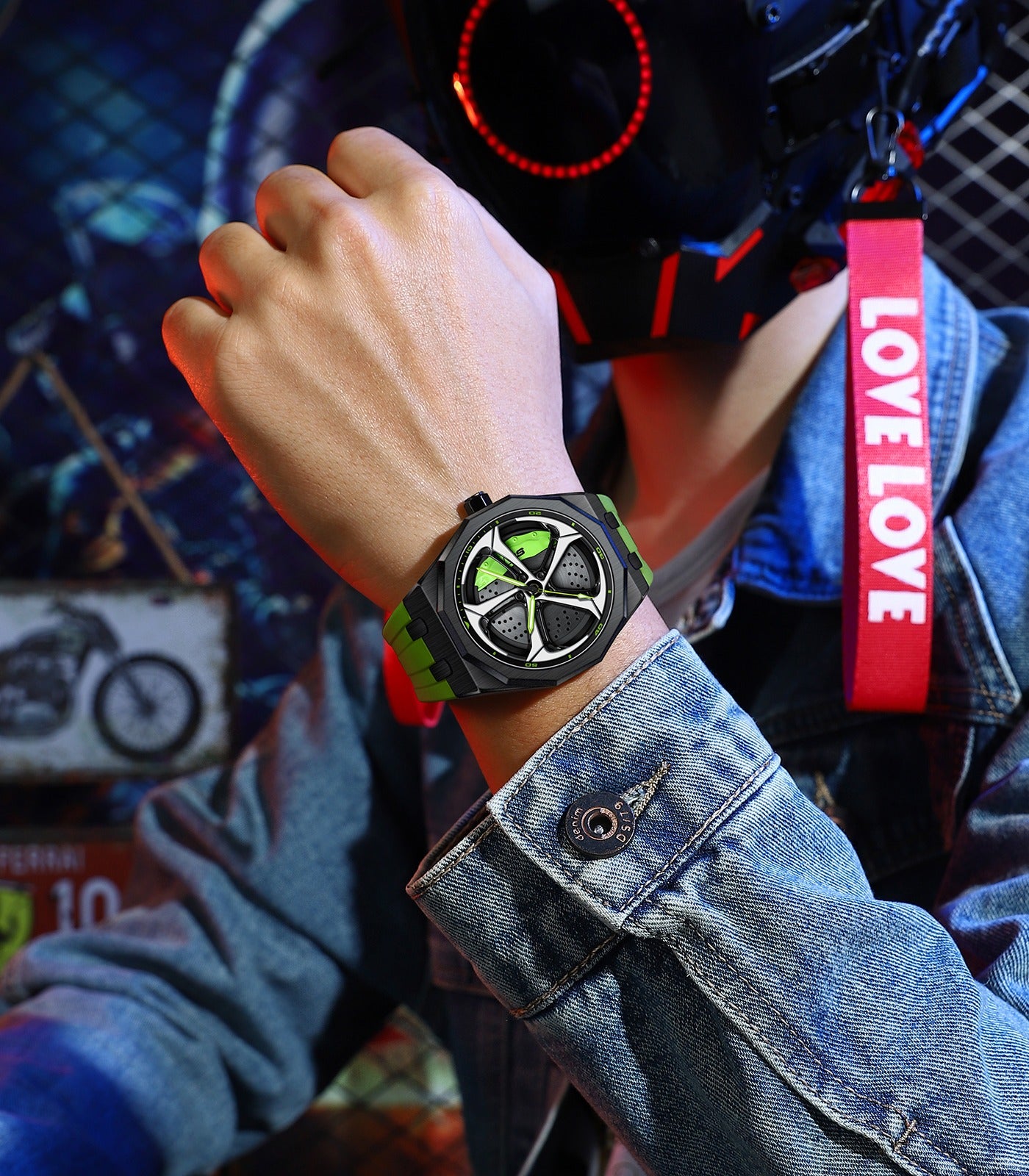 We have two different type of watches, spinning and non-spinning watches. Not every model is available in both. The non-spinning watch is just like your traditional watch. The spinning variant is unique. When you twist your wrist, the wheel inside the watch face spins freely. This mimics the effect of a moving car!