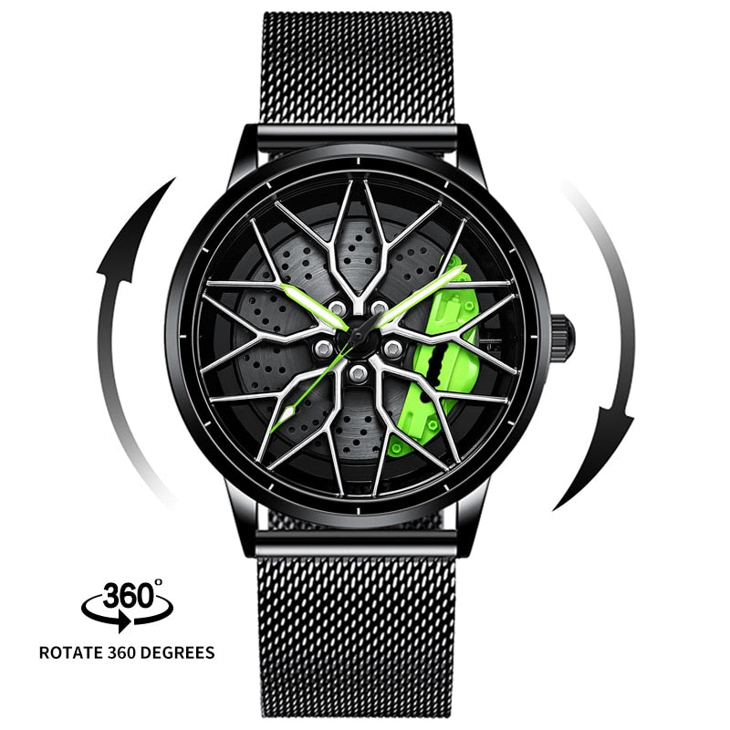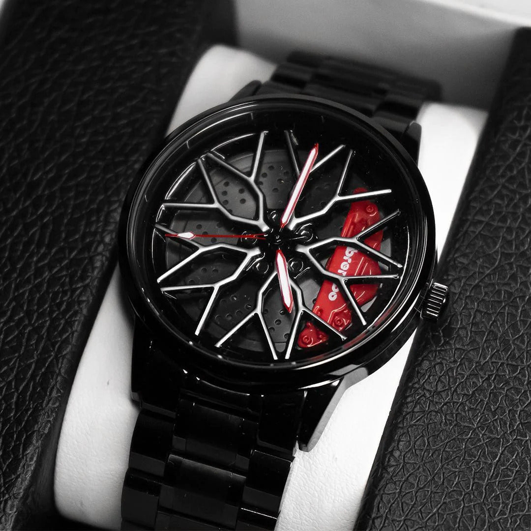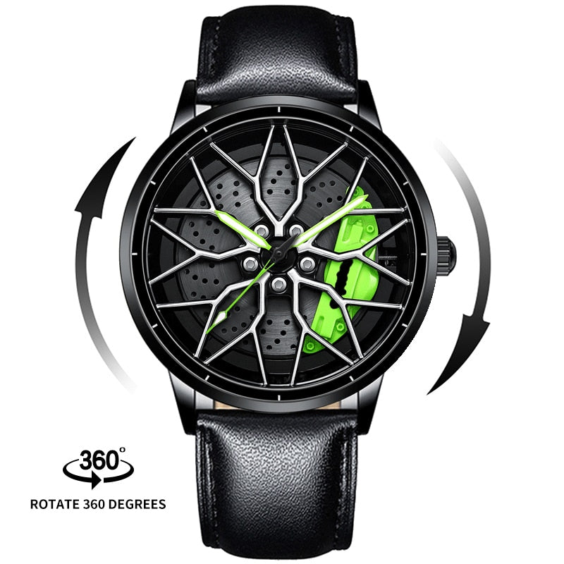 We have two different type of watches, spinning and non-spinning watches. Not every model is available in both. The non-spinning watch is just like your traditional watch. The spinning variant is unique. When you twist your wrist, the wheel inside the watch face spins freely. This mimics the effect of a moving car!
